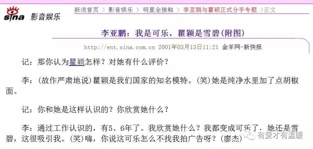 在媒體面前,兩人也沒少秀恩愛,李亞鵬說自己喜歡瞿穎的單純,“我是可樂,瞿穎是雪碧”。